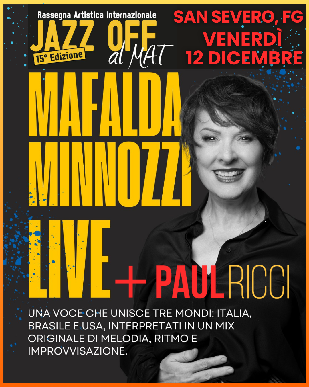 Venerdì 12 Dicembre 2025, ore 21:30, lo SPAZIO OFF si trasformerà in un palco internazionale. Con oltre trent’anni di carriera che l’hanno vista trionfare tra Europa, Stati Uniti e Brasile, Mafalda Minnozzi ha forgiato uno stile unico. Dal jazz americano alla sofisticata Bossa Nova, dalla profondità della canzone d’autore italiana alle vibranti sfumature della chanson francese, ogni nota è un invito a sognare. Il suo ultimo capolavoro, “RIOFONIC”, ne è la perfetta testimonianza.
